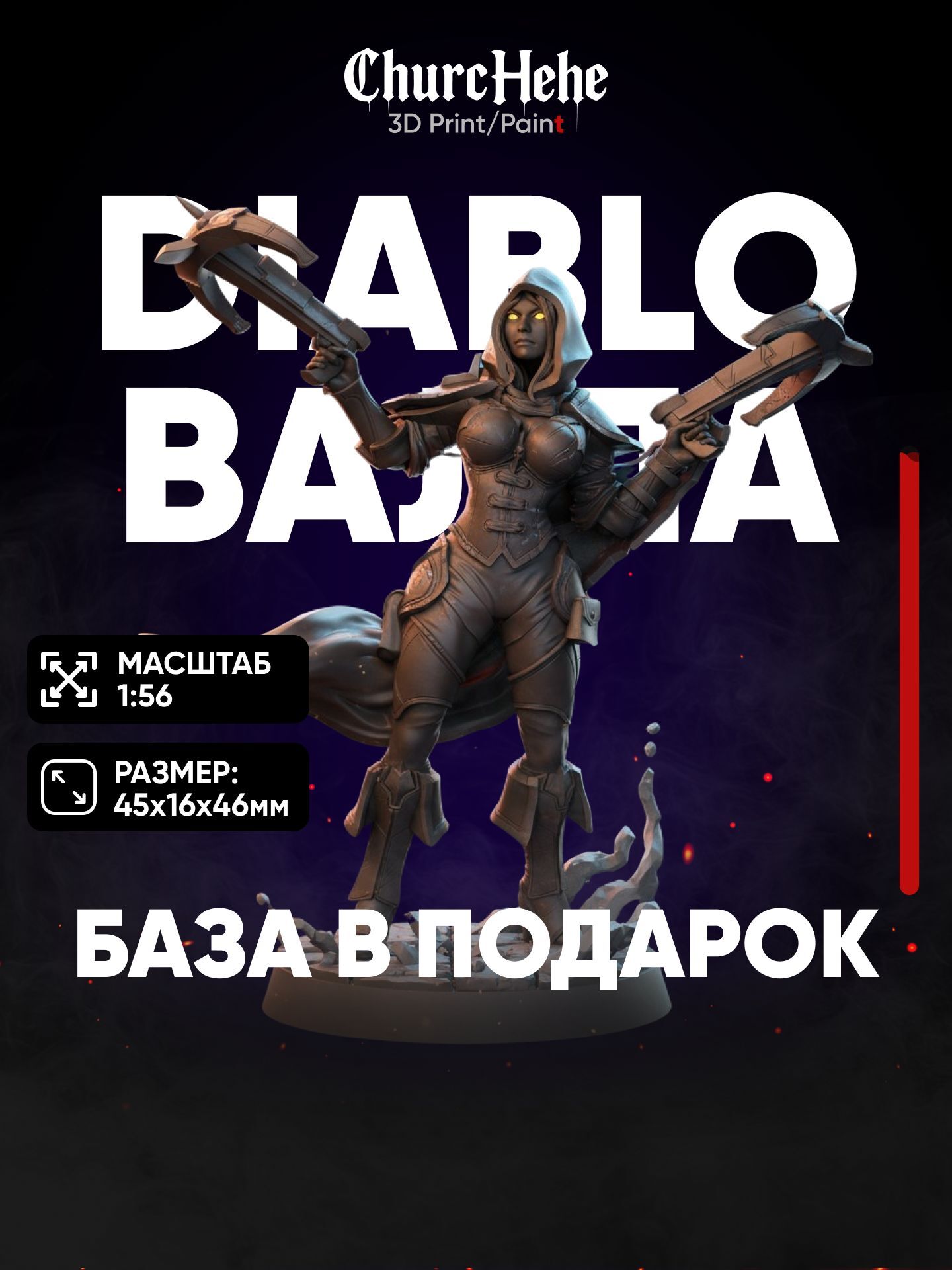 Миниатюрная фигурка «Валла Диабло Охотница на Демонов» выполнена из прочного фотополимера с высокой детализацией. Красный цвет и эргономичная форма идеально дополнят игровую сцену в настольных ролевых системах, таких как D&D 5e.